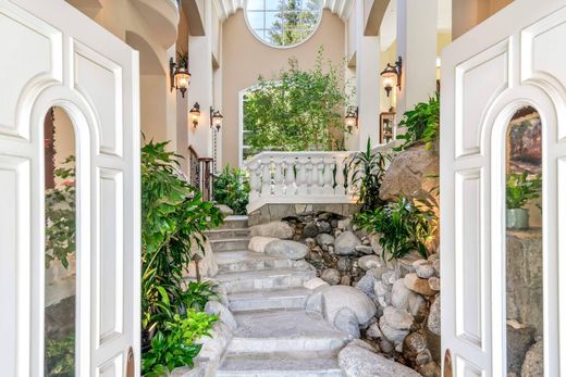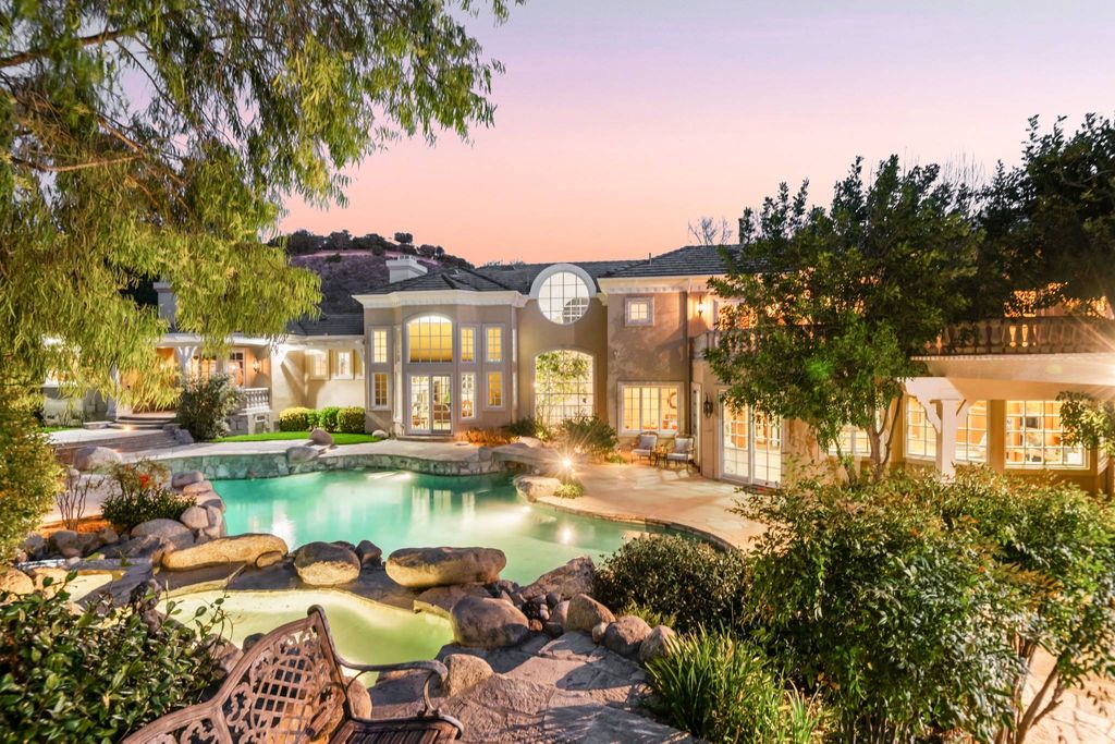 Nestled within the guard-gated North Ranch Country Club Estates, this exquisite property offers luxury and elegance. As you enter through the front entrance, you'll be welcomed by a serene indoor stream that sets the tone for the home's tranquil ambiance. The expansive living room, complete with a cozy fireplace, flows seamlessly into the family room and formal dining area, providing the perfect space for entertaining. The spacious kitchen boasts a center island, ideal for culinary adventures and gatherings alike. The primary suite features a bathroom and a generous walk-in closet, offering a private retreat. Additional highlights include a large loft space that can be tailored to suit your lifestyle needs. An exceptional guest house complements the main residence, featuring one bedroom, one bathroom, a charming living area with a fireplace, and a kitchen. The stunning backyard is an entertainer's dream, showcasing a custom pool, spa, and lush landscaping. You'll find a covered sitting area and a sport court, perfect for recreation and relaxation. With a six-car garage and enclosed RV parking, this property truly has it all. Experience refined living in a fantastic setting.