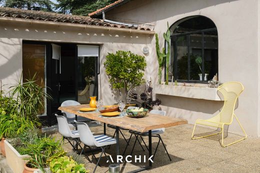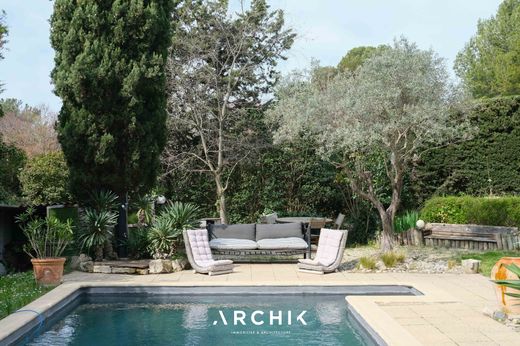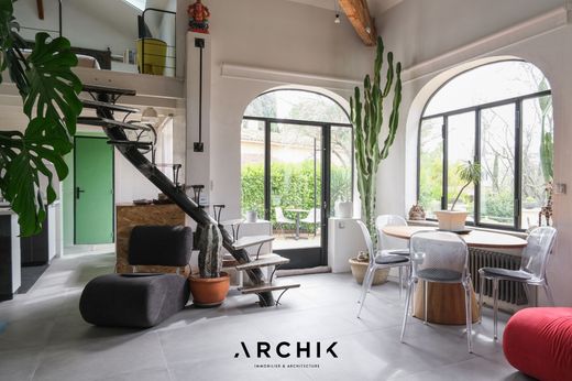 Built in the 1950s, this 120 m2 house and its 25 m2 outbuilding on its 950 m2 plot embody the perfect marriage of original architecture and a contemporary artistic vision, 10 minutes from downtown Aix-en-Provence. The project reveals a colorful and joyful aesthetic, inspired by the cinematic universe of Almodóvar. Modern materials blend harmoniously with period elements, creating a space where every detail is designed to breathe life and creativity. The superb arched steel windows offer a breathtaking view of the garden, a true living tableau where cacti, succulents, and Mediterranean species coexist. The ambiance of the whole evokes an artist's studio bathed in light, while the lush vegetation and climbing plants transport the spirit to South America. The living space is entirely open, enhanced by vibrant touches of color that energize the whole. The double height marked by the exposed framework is exploited with two mezzanines, accessible by a custom-designed staircase and a ladder, creating on one side an additional bed, and on the other an office space. The sleeping area includes two spacious bedrooms and two bathrooms, offering comfort and privacy. The independent studio, with bedroom, living room-kitchen and private terrace is ideal for hosting guests or considering independent rental. The garden slopes gently towards a swimming pool subtly integrated into nature, hidden from view. This haven of peace also benefits from numerous outbuildings and five parking spaces, offering ideal functionality for a life in complete serenity. A place that breathes creativity.