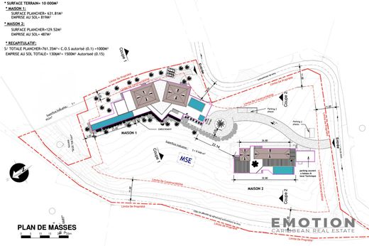 Land 10,000 m2 sea view 180?+ SF 2 luxury villas The Lowlands New EXCLUSIVE mandate Emotion offers for sale, in the heights of one of the most prestigious areas of Saint-Martin, an exceptional plot of land of 10,000 m2, with planning permission already validated for a project of two luxury villas, just a few minutes from the beach of Baie Longue and the Dutch part. This project also stands out for its exceptional feature in Terres Basses: thanks to the existence of an existing structure, the permit authorized the construction of the main villa on three habitable levels. This is a real asset, as the majority of buildings in the area are limited to a single level. This is one of the only properties in Terres Basses to offer three usable floors with views, volume, and rare architectural potential. ----- Building permit for: