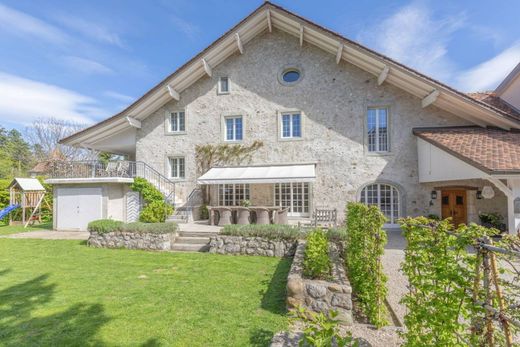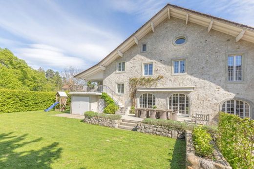 We're delighted to present this beautiful, fully renovated village property, distinguished by its charm and unique location, right in the heart of the village of Chéserex, in the Canton of Vaud. It is located in the immediate vicinity of public and international schools, such as one of the best Montessori schools in the Holy Land, Deux Mille Feuilles, or the La Châtaigneraie campus, as well as the Bonmont Golf & Country club (the Bonmont estate boasts a magnificent hotel, a GaultMillau award-winning restaurant as well as a prestigious 18-hole golf course and tennis courts). It is built on a beautiful private plot of over 600 m², with an intimate garden, 1 garage, vast terraces as well as a magnificent vaulted wine cellar. The property seduces the visitor from the outset with its charm, beams, old stone interior wall, magnificent volumes, soft hues and soothing ambience. Spread over 5 half-levels, the main features include a vast 80 m² living-dining-kitchen area with a beautiful fireplace, 5 bedrooms (one of which has been converted into a dressing room), and two bathrooms. A magnificent converted space of over 40 m² with high ceilings has been created in the attic (it is possible to create bedrooms and a bathroom). A company apartment of approx. 60 m², currently rented, completely refurbished, with an independent entrance is a complementary asset. All the materials used are noble and their careful selection has been carried out with constant attention to detail to offer comfort combining charm and modernity. Chéserex is a charming village located between Geneva and Nyon, known for its conciliatory tax burden. Accessible in 3 minutes from the Nyon freeway exit and close to all amenities, Chéserex stands out for its sports facilities (indoor swimming pool, tennis, sports field, golf and horse riding) and 4 restaurants. The Jura mountains and forests will delight nature lovers. There's also an elementary school and a grocery store open on Sundays.