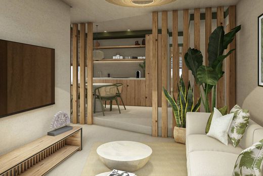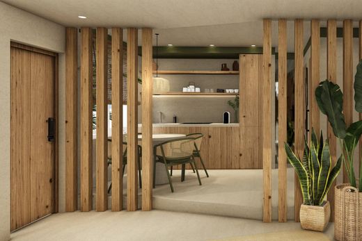 This modern 676.19 sq ft (62.82 m²) apartment blends functionality and style in a contemporary design inspired by nature. With 608.60 sq ft (56.54 m²) of interior space, it features an open layout that seamlessly connects the living room, dining area, and kitchen, creating a bright and airy atmosphere. The social area includes air conditioning and a convenient half bath for guests. The kitchen is thoughtfully designed for everyday use and includes a laundry area with washer-dryer.