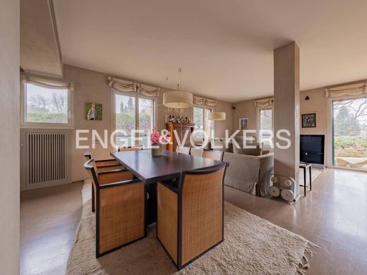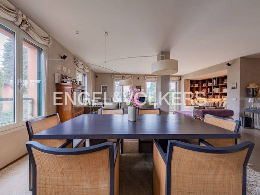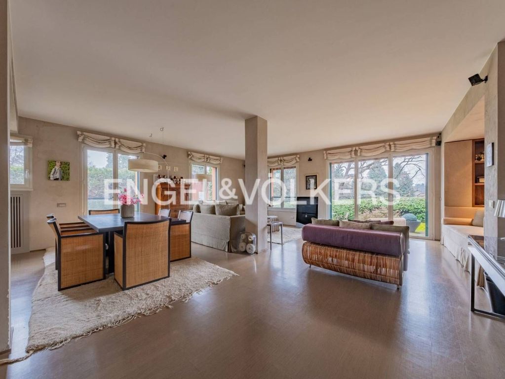 In the most private area of the Cortefranca condominium, within the exclusive Monticello Golf Club complex, we offer for sale an elegant high-end apartment arranged over two levels, enhanced by a double private garden and a stunning view of the golf course and surrounding mountains. On the ground floor, the bright living area opens up, where the main feature is a spacious living room with direct access to the main green area, ideal for enjoying the tranquility of the setting. The kitchen, modern and fully equipped with Gaggenau appliances, integrates harmoniously into the environment. Completing the floor is a versatile study with an adjacent bathroom, perfect as a workspace or guest area. A refined internal stone staircase leads to the lower level, dedicated to the sleeping area. Here we find four bedrooms, including one service room, and two elegant bathrooms. The master suite, with an en suite bathroom and walk-in closet, overlooks the second garden, a private and quiet oasis. The other two bedrooms, also with independent outdoor access, are separated by a movable wall that allows the spaces to be adapted to daily needs. The residence is distinguished by the refinement of materials, attention to detail, and a sophisticated home automation system that manages lights and comfort in every environment, creating a welcoming and contemporary atmosphere. The double green area — one more private, the other perfect for outdoor dining — is connected by an external staircase and offers the residence exceptional enjoyment of green spaces, perfectly in harmony with the elegance of the setting. Completing the property is a large double garage with double automated shutters. An ideal solution for a family seeking elegance, privacy, and quality of life, in an exclusive environment surrounded by greenery.