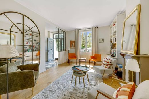 This 1920s property is in a leafy environment in the heart of the Le Vesinet Golden Triangle, the town’s most peaceful and secure neighbourhood. Set in a landscaped 709 sqm plot, it offers 167 sqm of bright living space including a double living/reception room with a fireplace, a veranda/dining room accessing the garden, and a separate equipped kitchen. Upstairs are a compact study/dressing room, two bedrooms and a bathroom. The top floor comprises a 3rd bedroom with a shower room accessing a terrace.