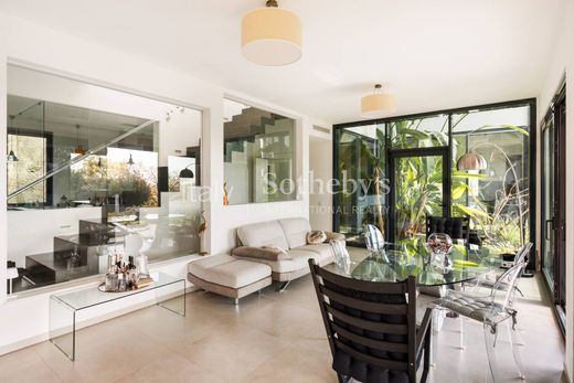 The estate offers approximately 650 sqm (6,996 sq.ft) of interior space and consists of a main villa spread over three levels, along with a stylish adjacent loft. The ground floor features a spacious and light-filled living room, enhanced by large French doors overlooking the pool, an elegant dining area, and a fully equipped kitchen. Upstairs, the sleeping quarters include three bedrooms and three bathrooms. The primary suite features an en-suite walk-in closet. Also on the upper floor is a generous living area, adorned with panoramic windows, a charming fireplace, and the spectacular vertical garden. The independent loft offers a large open-plan layout with a kitchenette and living space, accommodating up to four guests-perfect for hosting or as a guest residence.