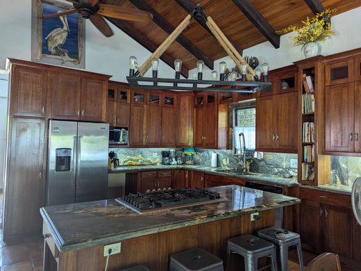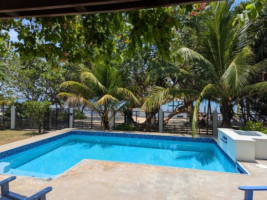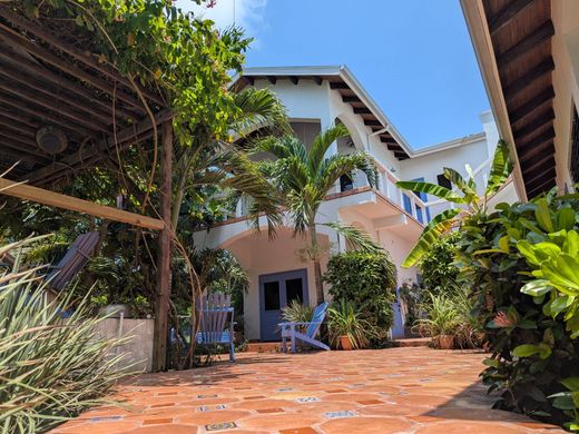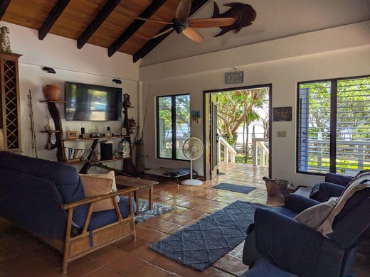 Hemmingway meets Frida Khalo on the shores of the Caribbean. Purpose built hideaway home with a MExican flair for the young at heart, for those that have found solace in their lives, far from the maddening crowds. This almost 14,000 square foot lot is bigger than the normal beach lots around and that's before the 66 foot beach reserve. This well-maintained garden lot features a guest cottage and a main house, equipped with a swimming pool, observation deck, pier, Mexican style courtyard and a boat lift area. Each dwelling includes laundry facilities. Additionally, the main house has a large cistern that collects rainwater for free. The main home boasts a versatile hardwood kitchen with very distinctive granite tops flecked with hints of blue to mirror the sea, a mere 30 steps away. All of this open plan onto the living area and a home office. Don't forget a very relaxing front porch to sip sundowners on. The entire house has beautiful handmade Mexican Saltillo tile thruout! Find your way up a hardwood staircase and you will find the main and only bedroom in the main house. Proceed through the built-in cupboards to access a spa-inspired bathroom that features a stone clad bathtub, shower, and separate his and her basin areas. We also have a roof top look out area that leads off the bedroom porch for those cool breezes on hot nights. The bedroom has its own dedicated porch for morning coffees. At ground level a tropical established garden surprises one at every turn, Gumbo limbo trees, ferns, orchids and more compliment a large pool with delightful terracotta tile surrounds dotted with imported accent Spanish tiles. A few steps to the beach chairs and a pier leading to a large seating area with fittings for a boat lift. A Huge garage completes the ensemble. Something for everyone!
