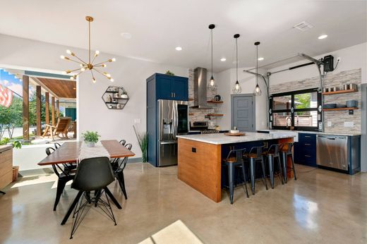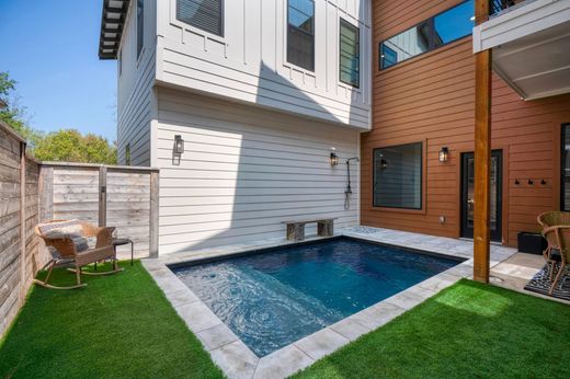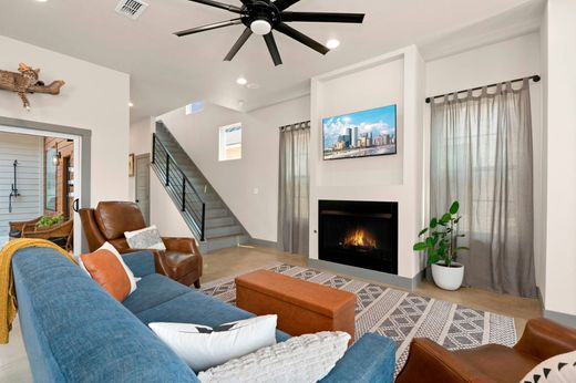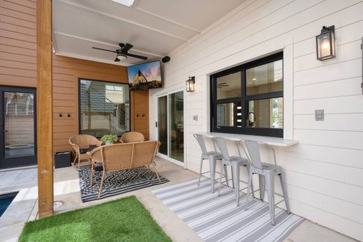 Tucked into one of New Braunfels’ most sought after neighborhoods, this exceptional two story modern home blends sleek design with the charm of a tight knit community. Designed with everyday luxury in mind, the open concept floor plan flows effortlessly between the living, dining, and kitchen areas, enhanced by soaring ceilings, abundant natural light, and premium finishes throughout. At the heart of the home, the chef inspired kitchen features a unique garage door window that opens directly to the outdoor entertaining space, perfect for serving drinks by the pool. A whole home surround sound system enhances both indoor gatherings and outdoor relaxation. The primary suite offers a peaceful retreat with a spa inspired en suite bath, featuring a spacious walk in shower, dual vanities, and a generous walk in closet. Upstairs, you'll find well sized secondary bedrooms and a flexible loft area ideal for a home office, game room, or media lounge. An additional space above the secondary bedrooms is prepped for finish out with A/C and electricity. Step outside to your own private backyard oasis, featuring a 10x15 heated plunge pool that can be enjoyed year round. The low maintenance turf lawn adds ease and beauty to the space, while the oversized garage provides ample storage or room for a golf cart. With a walkable location near local shops and restaurants, and a layout designed for both everyday comfort and stylish entertaining, this home truly captures the quintessential New Braunfels lifestyle.