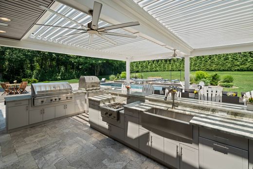 As featured in JamesEdition: Every moment feels like a retreat for guests of all ages at this completely remodeled and expanded Colonial at 15A Shore Rd. Fully renovated in 2020, this 4~5 bedroom retreat offers a slice of paradise tailored for both grand entertaining and intimate moments of relaxation. Set on a private 1.83 acre lot, featuring a 5,400 sq ft main residence and bonus building with humidor and Golfzon golf simulator, one of the most advanced golf simulators in the world with an auto-tee feature, moving swing plate that adjusts based on your lie and full putting simulation with LED guide. The large flex space on the upper level, creates an inspiring atmosphere for an office, a creative studio, gym or a serene yoga retreat. This versatile area is the canvas upon which countless stories of productivity, inspiration, and tranquility can be painted. Outside, a gorgeous low maintenance fiberglass heated pool with automatic cover, fire bowls, tiki torches, outdoor kitchen with a Lynx pizza oven and DCS grill complete this backyard private oasis. Use the oversized burner for the quintessential New England lobster feast. With hidden outdoor speakers tied into the full home Sonos audio system with over 150 speakers, easily enjoy your favorite movie or sporting event on the weather proof TV while relaxing in the hot tub. The private patio is designed for year-round enjoyment with a built-in fire table, pool with tanning ledge and pergola which opens and closes.
