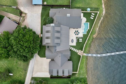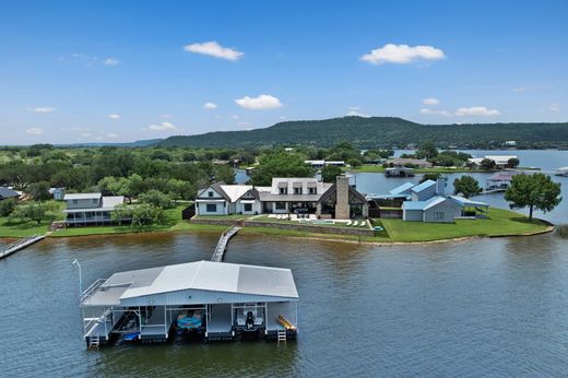 Waterfront Luxury in Gaines Bend on Possum Kingdom Lake. This stunning lakefront retreat offers resort style living with unmatched amenities and views. Nestled in exclusive Gaines Bend, the property features a heated spool with tanning ledge, water features, and in pool bar stools perfect for entertaining. The outdoor kitchen is fully equipped with premium Wolf appliances, beverage cooler, griddle, burner, ice maker, and built-in trash and storage, all anchored by a wood burning fireplace with a gas starter and built-in patio heaters. Inside, enjoy panoramic lake views through expansive sliding glass doors in the living areas and primary suite, which also feature gas fireplaces. The gourmet kitchen boasts Wolf appliances, a Scotsman top-hat ice maker, and oversized built in Frigidaire fridge and freezer. Two guest bedrooms offer private en suite baths and walk in closets, while two large bunk rooms (that sleep 19) are designed for hosting a crowd. Your private dock includes three oversized slips one with hydro hoist and two with mechanical hoists plus two jet ski ports, an upper deck with rope swing, diving board, commercial ice maker, and hose bib. Additional highlights include turf yard, outdoor shower, dual washer dryer sets, Control4 smart home system, Protect security, BUG misting system at house and dock, and a 2 car garage. Whether you’re hosting a crowd or enjoying peaceful lakefront sunsets, this exceptional property offers the perfect blend of luxury, comfort, and adventure making every day feel like a getaway.