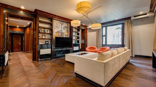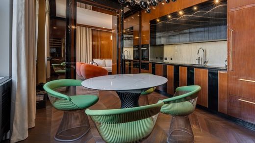 Property number: 023881. EXCLUSIVE! Luxurious three-room executive class apartment with expensive designer finishing from a famous architectural bureau in the most prestigious and sought-after location of Moscow on Patriarch's Ponds in one of the best houses of the Central Committee. The functional layout includes a large entrance hall, guest bathroom, laundry room, spacious living room with a beautiful terrace, kitchen, master bedroom with its own bathroom with a window and a large dressing room with a window, guest/children's bedroom with its own bathroom. Expensive materials and valuable types of stone and wood, textiles were used in the finishing. Household appliances Miele, Gaggenau. Italian furniture and lighting from famous luxury brands. Air conditioners are installed. The apartment has a large number of windows and storage cabinets. High ceilings. Beautiful views towards Patriarch's Ponds, the reception house of the Ministry of Foreign Affairs, and the courtyard. Large gated area with a playground and a walking area. Lots of greenery, well-kept landscape. Parking in a closed adjacent territory. Access control, concierge. We cooperate with partners. Prompt showing.