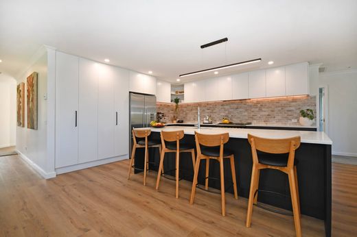 The new kitchen serves as a focal point and a masterpiece of design, making it a fabulous centrepiece for daily living. A wide stone island benchtop provides an ideal spot for gathering and includes extra storage cupboards underneath. The stunning storage continues with overhead cabinetry in white, accented by matte black underneath, creating a streamlined contemporary look. A double-width oven is centre stage, and the full-length tiled splashback adds a tactile element.