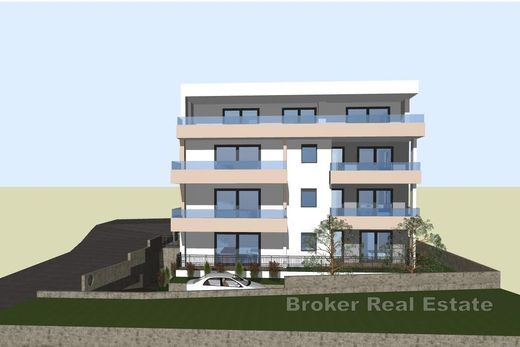 On the third floor of a new building is a penthouse with open sea view. The apartment has a total net area of 159.8 m², and consists of three bedrooms, two bathrooms, kitchen, living room, dining room and loggia. The buyer has the option of additionally purchasing a garage, outdoor parking space and storage room. All basic amenities are located in the immediate vicinity, while the beach is about 700 meters away. Due to the layout and location, the apartment is equally suitable for everyday life as for rental for tourist purposes.