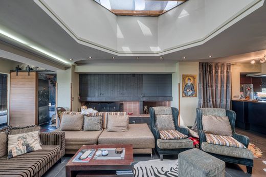 On the 1st level of the house, as we enter through the security armored door, we are first led to a very beautiful hall and then we find a large imposing salon-dining room with fireplace and kitchen, distinguished by luxury and high taste. The whole floor is surrounded by large bright windows with French doors leading to the terrace, garden and pool. As we continue, we come across the impressive kitchen which is fully equipped with modern built-in appliances.