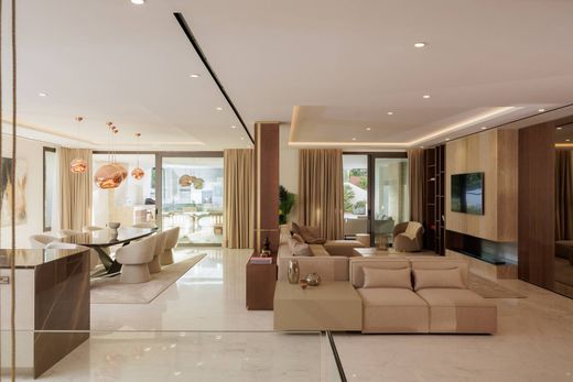 This exceptional ground-floor duplex apartment, located within the prestigious Epic Marbella development on the Golden Mile, offers an unparalleled blend of luxury, design, and lifestyle. Spanning an impressive 548 m² of built space, with 443 m² of refined interiors and 105 m² of terrace, the residence captures the essence of sophisticated coastal living. Facing west, the apartment enjoys abundant natural light from midday to sunset, with expansive views over manicured gardens and a tranquil lagoon-style communal pool, creating a serene and luminous atmosphere throughout.