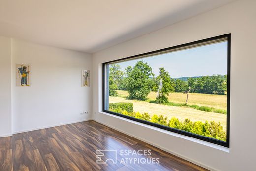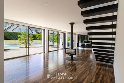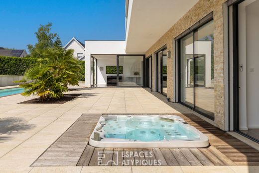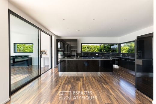 Located in the absolute tranquillity of a leafy cul-de-sac just a stone's throw from the Swiss border, this contemporary villa offers exceptional space on a wooded plot. Built in 2018, it enjoys a sought-after location and a rare level of amenities, including a lap pool, jacuzzi, panoramic terraces and triple garage. The living areas on the ground floor are entirely oriented towards the outside. The spacious and bright living room, with its large bay windows, is complemented by a family kitchen and a summer kitchen with a pizza oven, ideal for large, convivial gatherings. This level also includes two bedrooms, a shower room and a pantry. On each level, movement is facilitated by an internal lift serving all floors. The first floor features a spacious suite with a dressing room and shower room, a bedroom with its own dressing room, a third bedroom and a spacious bathroom with a double shower. A large terrace on this level offers breathtaking views of the surrounding countryside. The top floor is dedicated to a master suite with a dressing room and bathroom. The terrace offers an exceptional view of the surrounding countryside. In addition, the large basement offers a laundry room, cellar, utility room, wine cellar and a large storage area that can be converted as required. Outside, the 20-metre swimming pool and integrated jacuzzi blend harmoniously with the architecture of the house. The carefully landscaped garden is ideal for relaxation and outdoor living. The electric gate opens onto a large paved courtyard and a garage that can accommodate three vehicles. Unique in its fluid architecture, its overall volume and its location just a stone's throw from the Swiss border, this contemporary villa perfectly embodies the spirit of a singular property at the crossroads of borders. ENERGY CLASS: B / CLIMATE CLASS: B Estimated average annual energy costs for standard use, based on 2021 energy prices: between euros1,400 and euros1,950. Contact: Morgane 06.08.52.12.02