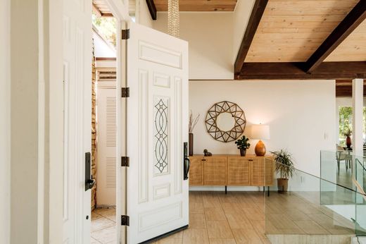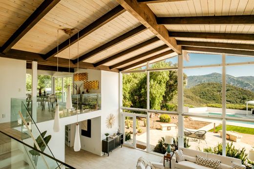 A Premiere Mid-Century Modern Haven with Unrivaled Views "Open one's world to the environment," proclaimed Austrian master architect Rudolf Schindler, an ethos fully realized in this exhilarating glass-walled estate. Perched on a private promontory in the Santa Monica Mountains, the residence commands sweeping canyon and mountain panoramas from every room, marrying iconic Mid-Century architecture with contemporary luxury. Step through grand double doors into a soaring, light-filled interior where the indoors and outdoors blend in perfect harmony. A newly re-imagined, chef-caliber kitchen cascades into the dramatic living room, its statement fireplace anchoring lofty ceilings and an airy open plan. Walls of glass unveil expansive wrap-around decks ideal for al-fresco soirees or a quiet sunset toast. Beyond, manicured grounds reveal a custom-designed swimming pool, shaded gazebo, and terraced gardens that frame jaw-dropping vistas at every turn. Sunrise bathes the home in golden light; ocean breezes drift up from Malibu by day; vibrant sunsets paint the horizon each evening. Tucked up a discreet private drive, this sanctuary offers instant access to pristine beaches, Direct access to world-class hiking and equestrian trails, celebrated dining, and the coveted Las Virgenes school district yet feels worlds away from it all. For those seeking premier design, soulful serenity, and an effortless indoor-outdoor lifestyle, this Modern Mid-Century masterpiece is where luxury meets nature in its purest form.