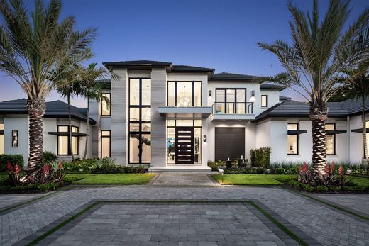 Vista Lago. On a prized southern-facing waterfront estate lot, this newly constructed, custom-curated home offers unmatched luxury, two blocks from Gulf beaches and the anticipated Naples Four Seasons Resort, capturing sweeping panoramic views across tranquil waters to the Fazio-designed championship golf course. This exquisite custom masterpiece is a triumph of luxury and architectural artistry. Encompassing 6,909 square feet of under-air living space, with a total build area of 11,742 square feet, the open-concept floor plan flows effortlessly between indoor and outdoor living, creating an ambiance of casual elegance and grandeur. The ultra-luxury interior selections for the home were expertly curated by the award-winning Freestyle Interiors, blending timeless design with today's sophisticated modern trends. Six spacious bedrooms with en suites, a private study, fitness room, and an open loft provide refined comfort and versatile functions. The gourmet kitchen is a culinary dream, with exquisite custom cabinets and Cristallo hand-fluted counters, a separate fully equipped chef's kitchen, custom coffee bar, and a sophisticated wine station highlights the Italian marble wall and island. Walls of glass reveal serene vistas from the expansive kitchen, living and dining spaces, all oriented toward the outdoor sanctuary. The waterfront resort-style pool and spa are surrounded by dining and lounge areas, along with a fully appointed outdoor kitchen, ideal for unforgettable entertaining. For the car enthusiast, the four-car air-conditioned garage is thoughtfully designed with capacity to accommodate up to eight vehicles with lifts. Penned by BECK Architects and expertly built by renowned Parker Hudson Homes, this is more than a home, it is an extraordinary lifestyle statement, where luxury meets legacy. Minutes to downtown Naples and a short distance to the beach. This is the epitome of the Naples lifestyle.