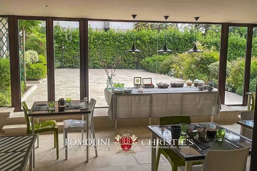 The building (750 sqm. 6 bedrooms and 10 bathrooms) is spread over three floors. On the ground floor the main door opens to an entrance hall with reception. Continuing on. there is a breakfast room with a service bathroom and a staircase down to the basement. At the rear of the building are three bedrooms (one with a private terrace) and two bathrooms.