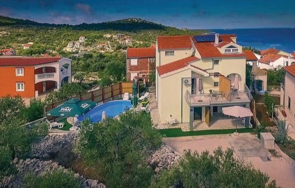 An apartment house of 5 apartments for renting with a swimming pool located in a popular tourist area near Rogoznica.