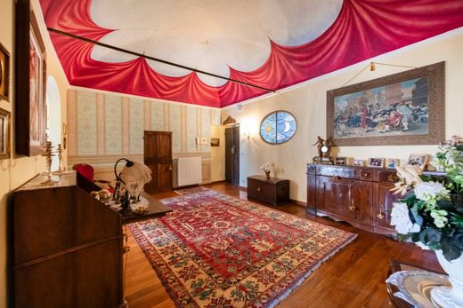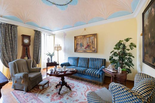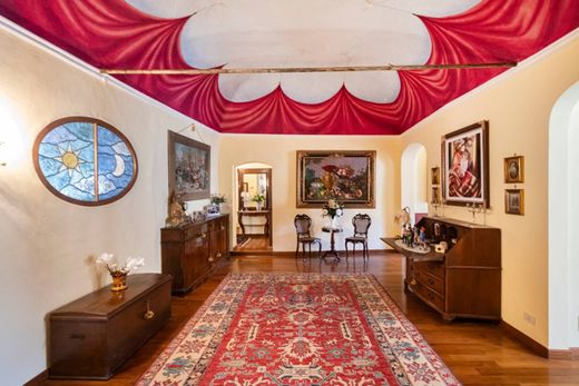 The Genoese-style entrance leads to an elegant sitting room and a bright living room embellished with 18th-century frescoes.