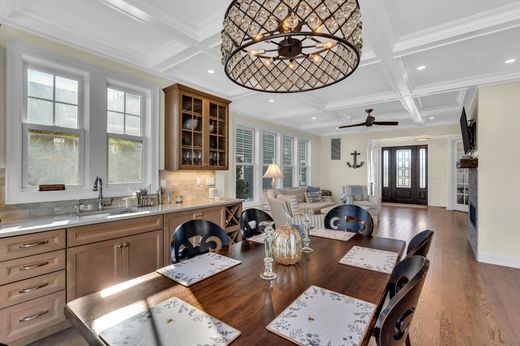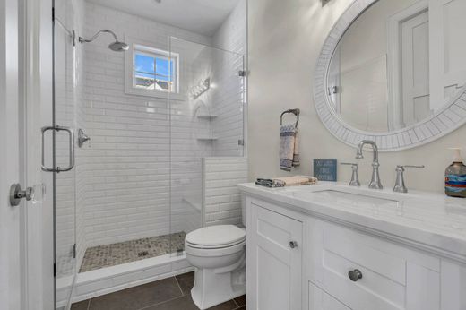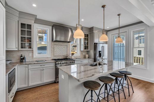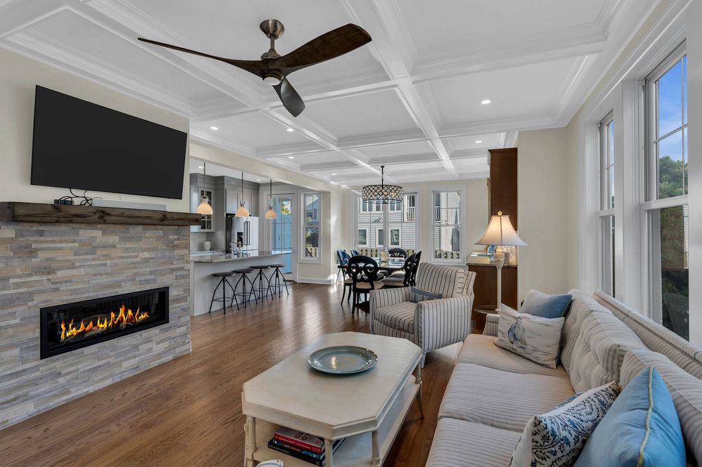 You catch glimpses of the morning sun as it glistens across the ocean while it rises over the horizon and a cool ocean breeze whispers through the window. This is the beginning of a perfect morning, a perfect day, a perfect summer ! And it is waiting for you at this magnificent coastal treasure. Tucked away in the coveted North End, with its quiet tranquility, this home offers peeks of the ocean and views of Stockton Lake. The crisp white exterior is complemented by bold black accents that enhance the architectural design and sleek lines of the home, while the interior is a reflection of its surroundings. Warm wood tones and buttery creams mimic the sand while muted blues and grays are a nod to the ever changing colors of the ocean. The main living space is open and airy, designed to capture the light while still defining each room's purpose. First, the chef's kitchen with stone elements, s/s appliances and an expansive island. It will entice you to cook , and the adjoining dining room, with an amazing butlers bar elevates the space to perfection. Next is the Great Room with its wall of stone and linear fireplace, a place to tuck into when the sun decides to stay hidden . A first floor bedroom and full bath complete the floor. Three graciously sized additional bedrooms and two stunning full baths welcome you to the second level with a spacious balcony for catching sunsets over the Lake. Not to be outdone, the outdoor entertaining area is the definition of summer. A paver patio, gas grill and the must have "outdoor shower" are what summer days are all about. But this home is not just about Summer, Autumn hues dance across the waters , Winters storms transform the landscape into a magical wonderland and Spring awakens with the songs of wildlife returning to the Lake. Whatever the season this home is meant for memories.