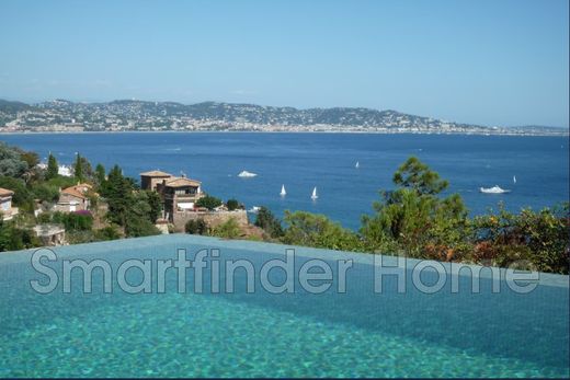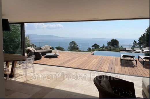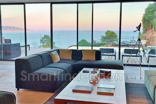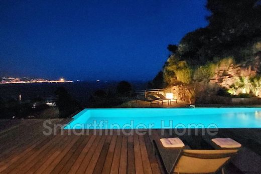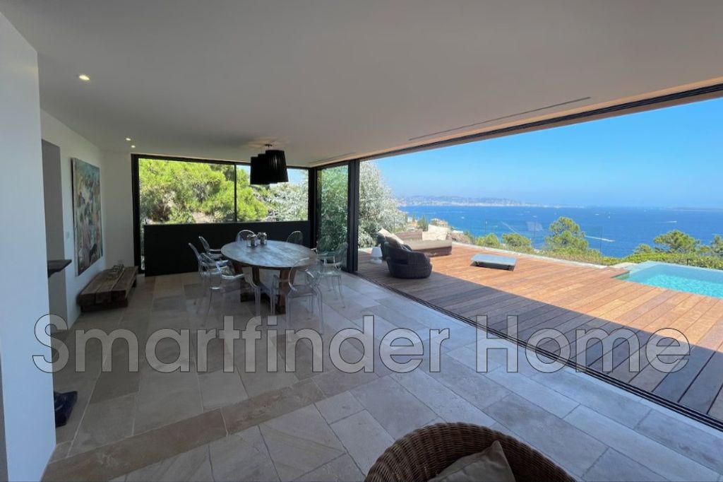 Superb contemporary villa, located high up in Théoule-sur-Mer, offering a panoramic view of the Bay of Cannes and the Lerins Islands and not overlooked. AVAILABLE 1st and last week of AUGUST and OCTOBER The beaches and restaurants of Théoule are within walking distance of the villa. The villa consists of a large living room with sea view, TV area and sofa with a bar, dining area opening onto the terrace with infinity pool. The modern kitchen is equipped and adjoins the living room and also leads to the terrace. On the same level as the living space is an en-suite bedroom with its shower room. Upstairs, 2 beautiful en-suite bedrooms, including the master bedroom, open onto a spacious terrace overlooking the swimming pool and sea view. 2 other en-suite bedrooms with their shower room and opening onto the exterior are located on the ground floor. Fully air-conditioned villa. TV in each bedroom. Double garage.