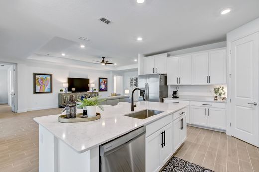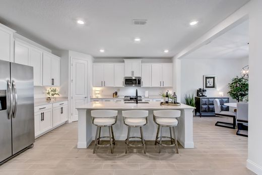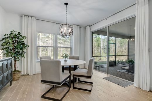 Move in ready Lennar Homes Medallion floor plan: four beds and an office, three baths, and many upgrades new construction does not offer unless substantial upcharges. Located in the exclusive gated 55 plus community - Lakeview in Tributary. Inside you will find upgraded tile throughout, open floor plan perfect for entertaining, and a split bedroom design. Office offers a custom wine bar and tray ceiling. The kitchen features stainless steel appliances, quartz countertops, large kitchen island, deep sink, and a gas slide in five burner double oven. Sliding glass doors off the dining room and the living room. The master suite features his and her vanities, extended walk in shower, and large walk in closet. Other upgrades include water softener, cabinetry hardware, faucets in kitchen and all bathrooms, lighting fixtures throughout, fans, and alum attic stairs. Community offers a lifestyle director, resort style pool, fitness center, dog park, pickleball courts, and private club for Lakeview residents only. Close to 95 yet still near the Amelia Island beaches. Schedule your showing today!