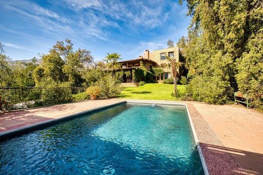 Property with Two Houses on a 10,000 m² Lot in El Arrayán, with Views of the Andes Mountains and All of Santiago Main House Chilean-style home built with stone and concrete Stone entrance with double-height ceiling Guest bathroom Living and dining rooms facing north, with access to the terrace and garden Double kitchen: one large and traditional, and another more modern and custom-designed by the owner, who loves to cook Spacious laundry room, double maid’s quarters with shared bathroom Office with garden access En suite bedroom with walk-in closet Second Floor Hallway with office space and garden view Master bedroom with panoramic views and a spacious covered terrace Marble bathroom with jacuzzi, shower, double sink, and access to a private terrace Double walk-in closet with skylight Stairs lead to a third bedroom or office with natural light, sharing the main bathroom Additional en suite bedroom with walk-in closet Detached room with bathroom currently used as a gym Parking for 6 cars Caretaker’s House 2 bedrooms and 1 bathroom Combined living-dining area with access to a terrace Parking for 5 cars Extras Swimming pool Electric gate Stone-paved driveway and entrance walls Landscaped garden maintained by a gardener (1,200 m²) plus 8,800 m² of native vegetation Monthly maintenance fees: CLP 300,000