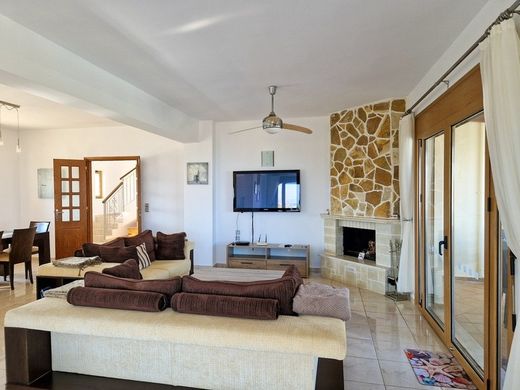 Spacious Villa with Unobsructed Outstanding Panoramic Sea View in Kokkino Chorio Apokoronas Description A beautiful well-maintained villa for sale in Kokkino Chorio Apokoronas. located in a quiet area with outstanding, unobstructed sea and mountain views. This home is ideal for a family wanting a permanent home, as it light and airy and has all the comforts one requires for summer and the winter months. However, it would make an excellent rental property as it has a swimming pool, close to the beach and to amenities, with the amazing views, which can be admired from virtually all angles. There are balconies, terraces and various outdoor seating areas for relaxation and entertainment. The house has a 119m2 fully tiled basement with a garage and various storage areas. Upstairs is a spacious open plan living, dining and kitchen area. The area is light and airy with light flooding the area from large balcony doors that open out onto a terrace with lovely sea views and direct access to the pool area. There is a traditional fireplace in the living area creating a spectacular focal point with its stone finish. The kitchen is fully fitted with white cabinets and counter tops with a marble type finish. It is fully fitted with all electrical appliances. A double bedroom with fitted wardrobes, a balcony with pool and sea views and a separate bathroom, can also be found on this level. An internal staircase with handmade balustrades, takes you up to the top level. Here two double bedrooms are located, both en-suite. Both bedrooms have balconies with sea views, have fitted wardrobes, air conditioning and ceiling fans. At the poolside is a covered area with a BBQ, ideal for outdoor dining and relaxation. The property is secure with a stone wall and a lock-up gate at the entrance. Kokkino Chorio is a beautiful, quiet, and peaceful village with a taverna and fully equipped mini-Market. The village of Plaka nearby has all necessary amenities including excellent taverns, bars, grocery stores and cafes that remain open all year round. The village is just a 5-minute drive from the sandy beaches of Almirida that is a popular seaside village with all the necessary amenities and offers the perfect holiday package with Sea food Restaurants, traditional tavernas, supermarkets, bakery, chemist, diving centre, gift shops, taxi, and car rental services and 10 min from the village town of Kalives. The distance from the historic town of Chania is 27 km, about a 25-30-minute drive. BENEFITS: Features