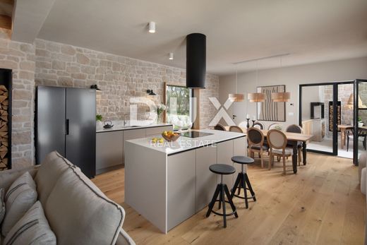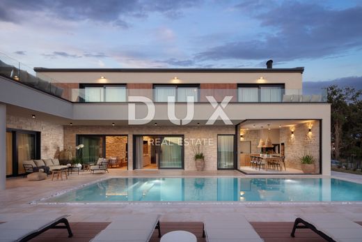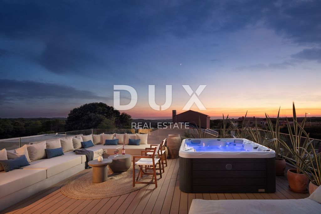 Tinjan – mjesto koje ponosno čuva bogatu povijest i tradiciju svoga kraja, a istovremeno svakim danom obogaćuje turističku ponudu raznovrsnim sadržajima i kvalitetnim smještajem. Od 2006. godine, treći vikend u listopadu, Tinjan je domaćin međunarodnog sajma pršuta (ISAP), manifestacije koju godišnje posjeti preko 20.000 ljudi, čime je stekao status Općine istarskog pršuta. Još jedna značajna tradicija ovoga kraja je kovački zanat – tinjanski kosiri nadaleko su poznati, a na blagdan Sv. Šimuna održava se i "Smotra kosira" koja okuplja kovače iz cijele Istre. Upravo 3 km od ovog slikovitog gradića, smjestila se moderna dizajnerska vila s wellnessom, grijanim bazenom i pogledom na more. Ukupna stambena površina iznosi 220 m², raspoređenih na prizemlje i kat. Raspored prostorija: • Prizemlje: prostrani dnevni boravak, kuhinja s blagovaonicom, jedna spavaća soba s vlastitom kupaonicom, dodatni WC i ostava. • First floor: hallway, four bedrooms, each with its own bathroom, and a wellness room that provides future owners with a complete sense of relaxation and luxury. Land and additional facilities: • Plot area: 828 m² • Heated swimming pool, ideal for use throughout the year • Summer kitchen - perfect for socializing in the warm months • Covered parking for several vehicles Technical characteristics: • The villa is built of high-quality materials • The first phase of underfloor heating has been installed with a heat pump system that ensures a comfortable temperature and energy-efficient heating during the winter Location and advantages: • 16 km from Poreč, one of the most attractive tourist destinations on the Adriatic • Peaceful surroundings, ideal for vacation and living • Sea view • Perfect as an investment for tourist rental or for those who want a luxurious family home in Istria This elegant designer villa represents the perfect combination of Istrian charm, modern luxury and supreme comfort. Whether you are looking for an exclusive family home or want to invest in a property with high tourist rental potential, this property offers everything you could wish for – peace, privacy, quality and amenities that rarely leave anyone indifferent. Don't miss the opportunity – a luxurious life in the heart of Istria awaits you.