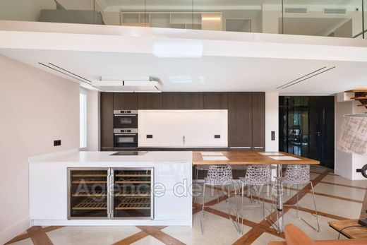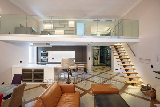 This elegant apartment, recently renovated to a high standard, offers an ideal layout: a beautiful entrance leading to a spacious and bright living room with an original fireplace, large French windows boasting a lovely view of the residence's park, and an impressive ceiling height of nearly 5 meters. The open kitchen, connected to the living area, is fully equipped. On the same level, you'll find the master bedroom with a shower room, dressing area, guest toilet, and a second bedroom with its own shower. A third bedroom with a shower room occupies the first floor. The mezzanine provides two separate areas for a TV lounge as well as a study. Included: private outdoor parking. The legendary Boulevard de la Croisette, the beaches, and shops are just a few minutes' walk away. A true gem waiting to be discovered without delay!