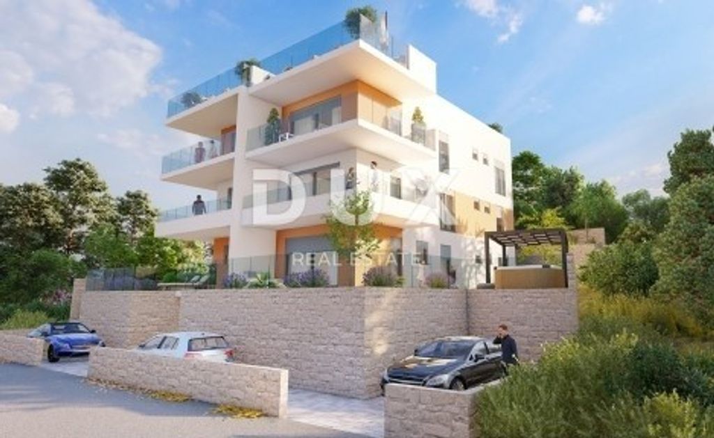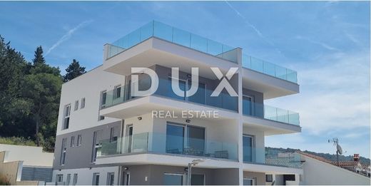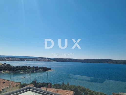 In a quiet, dead-end street in the immediate vicinity of the sea, a penthouse apartment with a private roof terrace and a garage is for sale. The apartment is located 120 meters as the crow flies from the sea and is only a few minutes' walk from the beach, the old town of Trogir, the ferry port and the nautical marina. The apartment (designation: Apartment 5) with a total interior area of approximately 58 m² consists of a living room, two bedrooms and two fully equipped bathrooms. In addition to the living area, the apartment has a covered balcony of 20 m² and a private roof terrace of 78 m² which has connections for hot and cold water and an electrical connection for a jacuzzi system or solar panels. The apartment is located in a building that is connected to the city sewerage system, with a use permit, and separate metering of electricity and water consumption. The floors of the apartment are covered with high-quality ceramic tiles, and heating is provided by an underfloor electric system throughout the apartment. Individual air conditioners are installed in all three rooms (living room and two bedrooms). The windows are PVC with triple-layer IZO LOW-e glass, and the shutters are electric, with mosquito nets. The price of the apartment also includes a 15 m² garage with a 220 V connection, designed for charging an electric car. The building is located next to a green zone where further construction is not allowed, which ensures the preservation of the view of the sea and the bay, as well as an additional level of privacy and peace. Distances: 6 minutes walk to the beach 8 minutes walk to the old bridge and the center of Trogir 8 minutes walk to the marina and ferry port 10 minutes drive to Marina Baotić 12 minutes drive to Split Airport (Sveti Jeronim) The apartment is ready to move in, with infrastructure adapted to modern living needs.