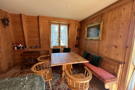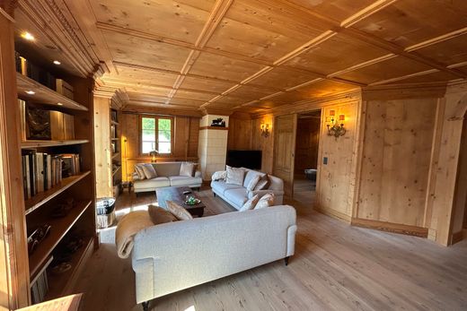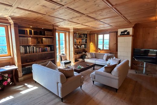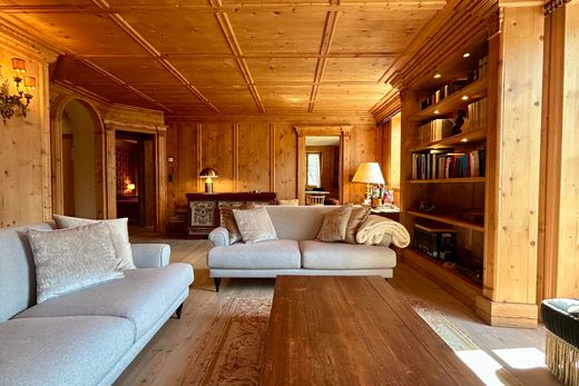 The elegant interior features fine wood paneling in traditional Engadine style, high-quality wooden floors, and luxurious silk wall coverings in the bedrooms, creating a cozy yet exclusive living atmosphere.