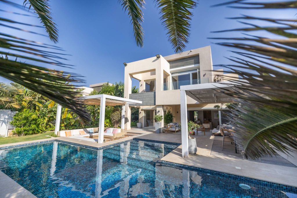 Nestled in Hacienda White, this villa presents a refined coastal retreat that balances contemporary elegance with the laid-back spirit of seaside living. Spanning 350 square meters of built-up area across two levels, on a 650-square-meter plot, the beachside home is finished to an exceptional standard. The interiors are calm and inviting, dressed in a palette of soft neutrals and natural textures. Living spaces flow seamlessly, where clean architectural lines are warmed by woven rattan chairs, light wood furnishings, and accents of earthy stone. Expansive glass doors flood the reception areas with sunlight and open directly to the outdoors, allowing the house to breathe with the Mediterranean air. Four bedrooms are thoughtfully arranged, each with its own sense of character. The master suite frames wide views through floor-to-ceiling windows, pairing a private terrace with a serene backdrop of greenery and sea glimpses. Guest rooms carry a breezy aesthetic, furnished with natural woods and woven details, evoking the understated elegance of a boutique coastal retreat. Seven bathrooms blend contemporary fittings with a spa-like ambiance. Outdoors, the villa embraces its role as an entertainer’s haven. A shimmering mosaic-tiled pool anchors the garden, flanked by tropical planting and mature palms that create both beauty and privacy. Two distinct terraces overlook the pool: one dedicated to dining, with a long, handcrafted table shaded by a lattice pergola, and another arranged as a lounge. Together, they form a seamless extension of the interiors. From the upper floor, a slight sea view glimmers beyond the horizon, a reminder of the villa’s prime coastal address. With its combination of crafted interiors, curated outdoor living, and a setting within one of the Mediterranean’s most exclusive communities, the property offers both a private sanctuary and a front-row seat to the North Coast lifestyle. Residents of Hacienda White enjoy access to white sandy beaches, beach clubs, and a vibrant social scene that defines the summer season along Egypt’s northern shore.