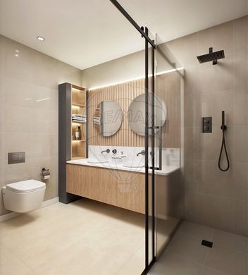 The interiors combine high-end materials – such as Margres ceramic wall tiles, Grohe faucets, and matte black aluminium frames with thermal break – with smart home solutions like recessed LED lighting, pre-installed air conditioning, and integrated home automation systems.