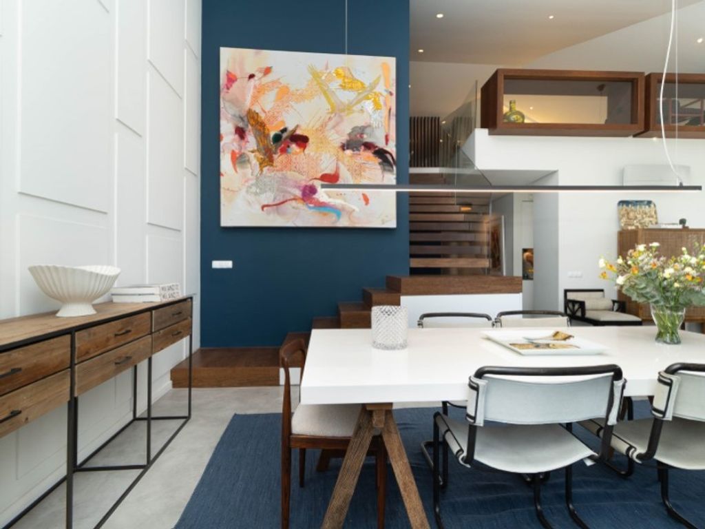 A striking wooden staircase, defined by bold architectural lines, gracefully connects to the duplex above.