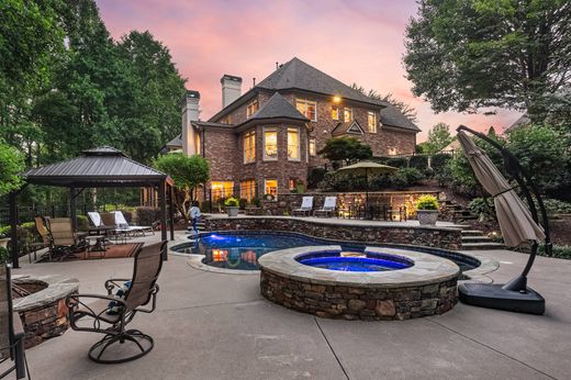 Introducing unparalleled luxury in this completely reimagined home in the coveted Falls of Autry Mill. This home embodies the perfect balance of modern luxury and timeless transitional design. From its commanding curb appeal to its flawlessly executed renovation, this home is a showpiece. Featuring a main level primary suite, resort-style saltwater pool, fully finished terrace level, and a three-car garage, this home offers luxury living at every level. Through wrought iron double doors, a grand two-story foyer unfolds with an executive office to the right and formal dining to the left. Beyond, the formal living room showcases floor-to-ceiling windows that frame sweeping views of the private wooded lot. The heart of the home is the incredible chef’s kitchen, an entertainer’s dream, anchored by an oversized quartzite island, professional-grade appliances, custom cabinetry with hidden drawer and organizing inserts, and designer finishes. Open-concept living continues into the cozy family room and spacious breakfast area, designed for effortless gatherings. Off the kitchen, the thoughtfully reimagined laundry and mudroom features herringbone brick floors, custom cabinetry with shiplap walls, and a convenient sink, leading to a "friends" door that provides easy access to the outdoor amenities. The main-level primary suite serves as a private sanctuary, featuring a corner fireplace and spa-inspired renovated bathroom complete with a freestanding soaking tub, seamless glass shower, separate quartz vanities and custom solid wood walk-in closet. Step directly from the primary bedroom onto your private saltwater therapeutic spa for the ultimate in relaxation and wellness. The upper level offers four generously sized bedrooms with abundant closets and three updated bathrooms, each featuring elegant quartz countertops, new lighting, and modern plumbing fixtures. The terrace level expands the home’s lifestyle offering with a second kitchen, professional exercise room complete with rubber flooring and mirror wall, an additional bedroom and full bathroom, dual entertainment spaces, and incredible storage. Outside, the manicured landscape and custom saltwater pool create your private oasis perfect for both entertaining and daily enjoyment. Exquisite details adorn this property, including a reimagined two-story fireplace with board and batten woodwork and custom bookshelves, pristine hardwood floors throughout the main and upper levels, designer lighting and draperies, elongated six-inch plantation shutters, epoxy-finished three-car garage flooring, and integrated smart-home automation. With newer roof and meticulously maintained systems, this residence offers the ultimate turnkey experience. This is more than a home, it is a statement of prestige, privacy, and lifestyle in one of Johns Creek's most exclusive communities. Imagine life at 135 Club Falls Drive.