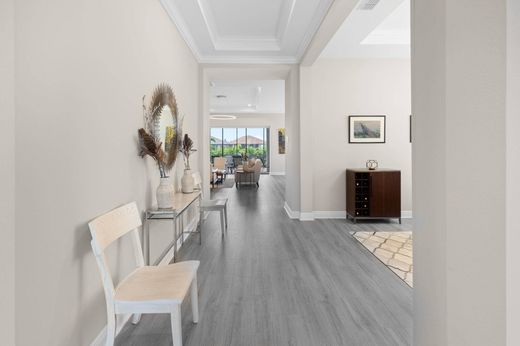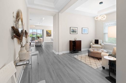 Esplanade at Tradition, 55+, Farnese model showcasing $120K + in builder installed upgrades. Featuring 3 bedrooms plus flex room, 3.5 baths, open floor plan, gourmet kitchen with quartz countertops, GE Profile appliances with gas range, laminate flooring, crown molding in tray ceilings, hi-hat lighting, modern fixtures, window coverings and bay window in primary suite. Pocketing sliders with power shades lead to an extended covered lanai with an expanded screen enclosure, pre-wired for pool and plumbed for outdoor kitchen. Added highlights: 4-ft garage extension, glass front door, dimmers and extensive landscaping. Community amenities include a resort clubhouse with pool, cafe', gym, spa event and card rooms, kitchen, outdoor BBQ and more.
