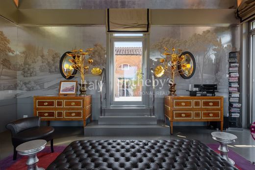 The extraordinary terraces, expertly organized into living, dining, and relaxation areas, offer evocative and unparalleled views of the city from every angle, becoming a natural extension of the home. The property occupies the fourth and fifth floors of a prestigious period building, equipped with a concierge and elevator, and is completed with a convenient private garage and a cellar.