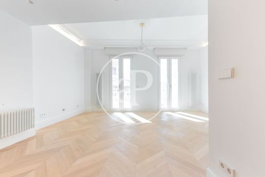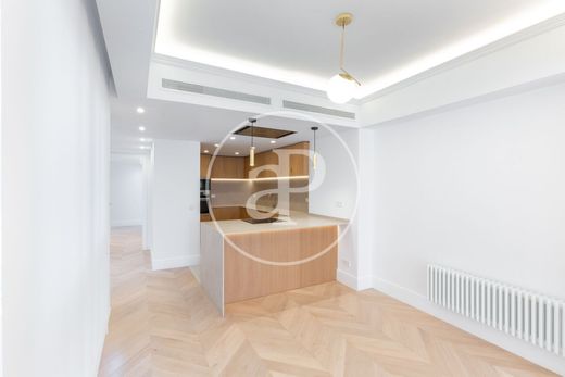 This apartment, bathed in natural light thanks to its fully exterior orientation, features three spacious double bedrooms with built-in wardrobes lacquered in white up to the ceiling, two elegant bathrooms —one with a shower and one with a bathtub— and a stunning living-dining room adorned with handcrafted moldings and carefully designed indirect lighting.