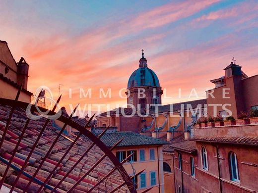 In the authentic heart of Rome's historic center, a few steps from Via Giulia and the elegant Piazza dell'Oro, we offer an extraordinary apartment, rare on the market for its location, charm, and quality of finishes. Located on the second and top floor of a historic building, the property offers spectacular views and a privileged perspective of the Jubilee Church of San Giovanni Battista dei Fiorentini, all the way to the dome of St. Peter's with its lantern and the famous golden sphere. Internal layout: the residence is spread over three perfectly integrated levels: • First level (living area): large entrance hall, bright and scenic double living room with suggestive views of the rooftops of Rome; separate, furnished kitchen; one bedroom; one bathroom. • Second level (master suite): large double bedroom with fireplace, custom-made walk-in closet, private bathroom, and panoramic terrace with exclusive views of the dome of San Giovanni Battista dei Fiorentini. • Third level (panoramic bedroom): charming room with spectacular window framing the dome of the Florentines; In the background, the silhouette of St. Peter's Basilica, with its lantern and golden sphere. Balcony with a large boiler room and laundry room. Finishes and comfort: The apartment has undergone a top-notch renovation, featuring fine parquet floors, custom-made fixtures and fittings, suspended ceilings with architectural design solutions, independent heating, and ducted air conditioning throughout. Exclusive location: Via dei Cimatori is one of the most charming and private streets in the historic center, just off Via Giulia, among historic buildings, Renaissance courtyards, and churches of extraordinary beauty. An ideal location for those who wish to experience the authentic atmosphere of the Eternal City without sacrificing comfort and privacy. Why choose this property: Unique and unparalleled view of two of Rome's most iconic domes, a prestigious property in a historic building, perfectly renovated. Exclusive panoramic terrace on the first floor, rare in the historic center, with windows offering suggestive views. Third floor terrace. It is the ideal solution as a prestigious residence or as a high-profile investment. Without Limits srl is not a franchise and operates only with "direct" agencies owned by the brand.