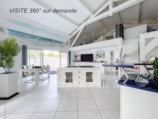 ELEGANT CONTEMPORARY HOUSE by the sea, High-end services. Ideally located in a sought-after coastal area, this beautiful property seduces with its neat architecture, its generous volumes and the quality of its services. Upon entering, you will discover a vast, bright living space composed of a living room - lounge - dining room opening widely onto the covered terraces and the landscaped garden. The ground floor also includes three bedrooms, including a superb master suite with private bathroom, a shower room, two separate toilets and a functional storeroom. Upstairs, a plateau of nearly 70 m² offers exceptional development potential: additional bedroom, office, games room or relaxation area, give free rein to your desires. The exterior, fully enclosed, wooded and landscaped, invites relaxation and conviviality, with spacious covered terraces directly connected to the living room. An outbuilding, workshop completes the ensemble. Located in close proximity to beaches, shops, and the town center, this property combines comfort, elegance, and a rarity in the area. An exceptional property to discover without delay. ARCADES PROPERTIES