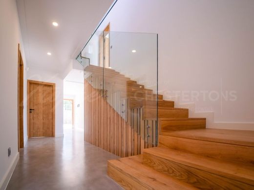 Price Recently Reduced From 1.995.000 Euros To 1.895.000 Euros. This recently renovated detached villa, situated in the highly sought after Fonte Santa area of Quarteira, offers an exceptional blend of modern luxury and convenience. Spanning two floors, this property is perfect for families or those seeking a spacious, well-located residence near the beach and essential amenities. Upon entering, you'll find a large, inviting living room featuring a cozy fireplace, ideal for relaxation or entertaining. The open-plan kitchen is ready to be customized to your personal taste, giving you the unique opportunity to design your dream cooking space. This floor also includes a laundry room, a guest bathroom, an office, and a games room, which can easily be converted into two additional bedrooms if desired. The upper level comprises 5 generously sized bedrooms, including one with an en-suite bathroom for added comfort. Additionally, there are two more bathrooms and three balconies offering panoramic views of the surrounding countryside. The exterior of the villa provides the perfect setting for leisure and entertainment, with a beautiful garden surrounding a private swimming pool. The property also offers ample parking space for multiple vehicles and is fully fenced, ensuring privacy and security. The villa comes equipped with modern conveniences, including air conditioning, electric shutters, advanced home automation, a video intercom system, solar panels, mains water, and a borehole for water supply. With its excellent access and prime location near the beach, this villa is an outstanding opportunity to enjoy life in one of the Algarve's most desirable regions.