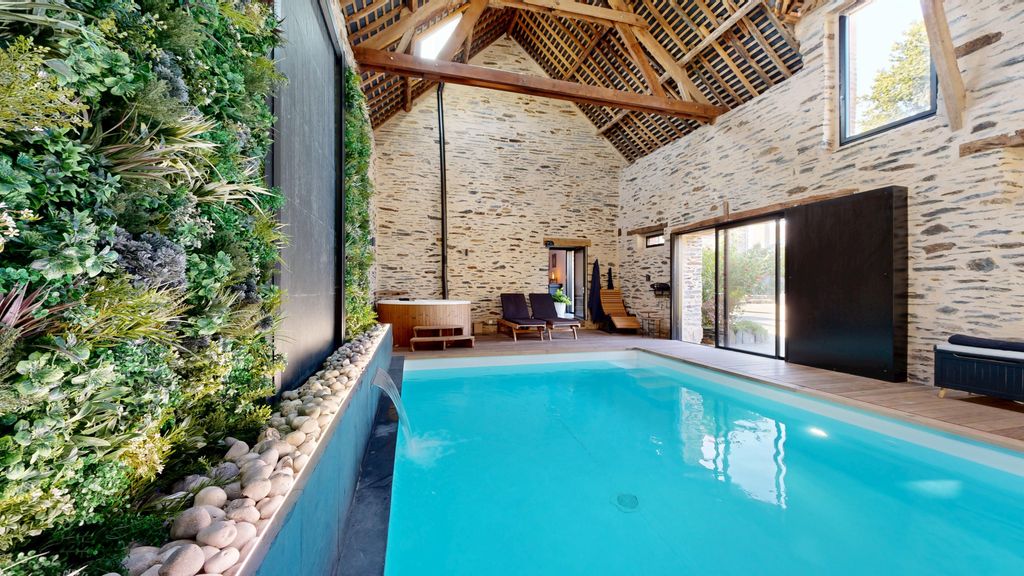 EXCEPTIONAL PROPERTY! Magnificent Character Property dating from the 19th century with Swimming Pool & Outbuildings in Massérac (44). **FULL VIRTUAL TOUR AVAILABLE UPON REQUEST** Located 8 minutes from Guémené-Penfao, 18 minutes from Redon, and just 1 hour from Rennes, Nantes, and Vannes, this property, built on a 9,829 m2 plot, combines authentic charm with high-end amenities. Tastefully renovated throughout, it offers a rare quality of life just steps from convenience. The main house This old stone building has been completely renovated and boasts beautiful, light-filled spaces: On the ground floor : a beautiful entrance with plenty of storage, a large living room with a wood stove, a cozy lounge with a wood-burning insert, a fitted and equipped kitchen, a laundry room and a separate WC. Upstairs : a landing leads to a shower room with WC, 3 beautiful bedrooms and a master suite with walk-in shower and WC. Dependencies Adjoining the main house, a magnificent stone farmhouse has been renovated and converted into a true leisure and relaxation space: On the ground floor : a bathroom, a technical room, an office, a gym/cinema room, and a 30m3 heated indoor swimming pool with counter-current swimming and a Swedish bath . Upstairs : a large bedroom, a dressing room and an office space on a mezzanine. The exteriors Lovers of authenticity will be seduced by the beautiful wooden terrace, the large covered thatched courtyard , a true convivial corner with a summer kitchen , perfect for entertaining. The property also includes several stone outbuildings: former pigsties, a detached stone barn with a bread oven , loft and solar panels, a carport with a two-wheeler garage ... The whole property is situated on a beautiful wooded plot, fully landscaped and enclosed , complete with a well and various species of trees. A rare find on the market This exceptional residence combines the charm of stone, modern comfort and multiple living spaces suitable for both relaxation and entertaining. A unique location, ideal for a characterful family residence or a high-end guesthouse project . To arrange a viewing, please contact your real estate advisor, CHARLINE LEFEUVRE, at 06.37.76.69.32 or by email at c.lefeuvre@winkey.fr Agency fees are to be paid by the sellers. Price: 480,000? agency fees included. Commercial agent 'EI' registered under number 987 731 403 RSAC of VANNES? Linked to T WINKEY card CPI 9501 2018 000 035 005? MMA professional liability insurance? Information on the risks to which this property is exposed is available on the Géorisques website: www.georisques.gouv.fr