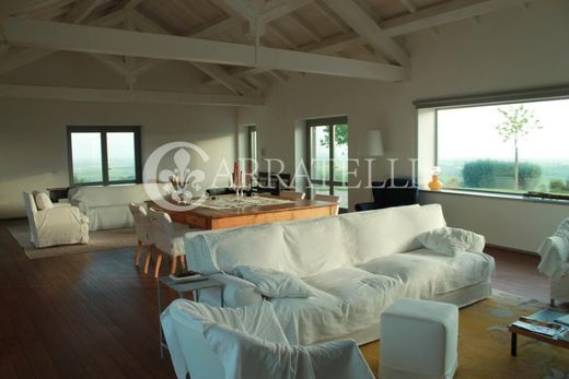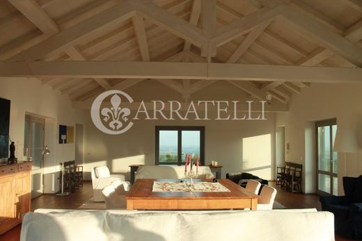 Exclusive design villa in Maremma. The property is built on a hill surrounded by 11 hectares of land and was entirely designed by an architect at the owners' request. What makes it even more unique is the 360-degree view, the finishes, colors, and materials used, which make it a residence of relaxing elegance. The house develops in an "L" shape with French doors on both sides. You enter the large living room with a fireplace and a 4-meter-wide sea view window, then access the very spacious kitchen, adjacent to which is a laundry room. A corridor leads to two bedrooms and a bathroom. All rooms have access to the surrounding gardens and the pool. The second part of the structure follows a long corridor with windows overlooking the century-old olive trees of the garden, leading to the master bedroom with an en-suite bathroom and a walk-in closet. Upstairs, there is a very large fourth bedroom that could become a mini-apartment with breathtaking views. The outdoor spaces are both panoramic and sheltered, especially the patio and the 20-meter-long pool that mirrors the house's geometries. The surrounding land includes uncultivated parts, a wooded area, and 700 olive trees. The property also features a technical room with a boiler, a cellar of about 40 sqm, and numerous parking spaces.