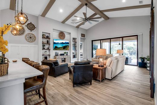 Introducing a residence of exceptional craftsmanship and timeless elegance, the Fairlead model by Homes by Towne, a gem in the desired Lakehouse Cove at Waterside in Lakewood Ranch. Encompassing over 3,000 square feet of refined single-story living, this impeccably maintained home offers three bedrooms, a private office, an expansive flex/game room, 2.5 baths and a spacious three-car garage, all set against a serene preserve backdrop with only one neighboring residence. Every detail of the home has been curated with an uncompromising commitment to luxury and style. The residence makes a stunning first impression with a beautifully landscaped exterior, slate tile roof, paver driveway and impact-rated windows. A grand entryway welcomes you into an open-concept layout that effortlessly balances everyday comfort with elevated design. Soaring ceilings with wood beam accents, designer lighting, and abundant natural light frame a warm and sophisticated interior. The great room is a showpiece, featuring a bespoke media wall with floating shelving, shiplap detailing, and contemporary finishes that invite relaxation and refined entertaining. At the heart of the home lies the chef's kitchen, a masterclass in form and function. Outfitted with LG InstaView ThinQ refrigerator, a five-burner gas cooktop, a combination wall oven and microwave, quartz counters, continuous backsplash and a large island with bar seating for five, this kitchen is a culinary enthusiast's dream. Two-tone cabinetry, metal hood and water filtration system complete the space. Adjacent, the formal dining area is elevated with board and batten detailing, ideal for intimate gatherings or stylish dinner parties. Enter through 9-foot impact sliders into a private outdoor retreat designed for year-round enjoyment. The expansive screened lanai features panoramic screening to fully showcase the breathtaking preserve views. Over 600 square feet of covered outdoor living includes a rich tongue-and-groove-stained wood ceiling, a luxurious 10-person spa, a summer kitchen with a custom garage-style door and elegant brick pavers, a setting designed to impress. The primary suite is a sanctuary of tranquility, thoughtfully at rear of the home to maximize privacy. Enjoy custom feature walls, dual walk-in closets with bespoke built-ins and a spa-inspired bath complete with dual vanities, a freestanding soaking tub and a walk-in shower. Two guest bedrooms offer deep custom closets and blackout shades for optimal comfort. Additional high-end appointments include a whole house generator, 8-foot interior doors, rolling barn doors, soundproof wall in the flex room, plantation shutters, plank tile flooring throughout, custom mudroom and laundry room, designer ceiling fans, built-in storage and a fenced backyard. Residents of Lakehouse Cove enjoy unparalleled amenities such as a boathouse for kayak and paddleboard storage and launch, two lakeside fire pits, a water taxi to Waterside Place, a stunning clubhouse with catering kitchen and lounge, fitness center, resort-style pool and spa, six pickleball courts, bocce ball, playground, dog parks and over 20 acres of pristine shoreline. Positioned just moments from the amenities and a golf cart ride to Waterside Place, and a quick drive to UTC and SRQ Intl Airport, this home also offers effortless access to world-class beaches such as Siesta Key and Anna Maria Island. This is more than a residence, it is a lifestyle of elegance, comfort and connection.