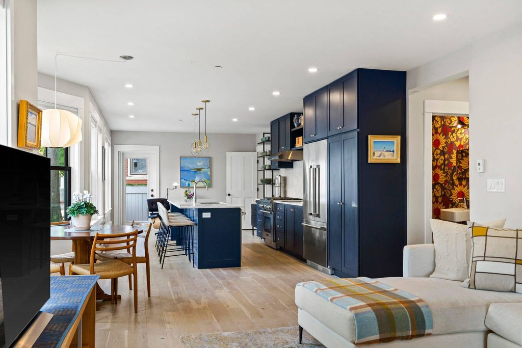 Gracing the top of Munjoy Hill, this condo offers a connection to the city's most beloved amenities and a lifestyle both refined and coastal. It is just moments from celebrated restaurants, neighborhood caf?s, the Eastern Promenade, and the sparkling waters of Casco Bay. Originally built with historic character and reimagined in 2018, this condominium balances preserved architectural details with high-end contemporary design. The sun-filled first-floor unit welcomes you with an open layout that connects the living, dining, and kitchen areas. A wall of windows brings in abundant natural light, while a private enclosed deck offers a peaceful outdoor retreat. The kitchen is both striking and functional, featuring rich blue cabinetry, open shelving, a herringbone tile backsplash, a large island with seating for four, and generous storage. Off the living room, pocket doors reveal a charming library nook with floor-to-ceiling bookshelves and a grand bowed windowa serene spot to read or unwind. The primary suite is a sanctuary with elegant wallpaper, deck access, and a spa-like ensuite bath. A second ensuite bedroom provides comfort and privacy for guests, while the powder room adds a designer touch with bold, modern wallpaper. Additional amenities include in-unit laundry, off-street parking, and a private storage area. Luxury, convenience, and timeless design converge in this distinctive Munjoy Hill homean exceptional opportunity to experience Portland living at its finest.