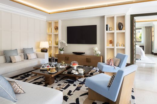 An open plan living and dining area, a closed kitchen equipped with premium appliances, and three well-appointed bedroom suites make up the primary accommodation. Each en-suite bathroom has sophisticated fittings and circular tubs that invite relaxation. There is a discreet connecting room to house staff as well, for additional convenience. Behind the villa is a private courtyard with shaded lounges and a swimming pool.