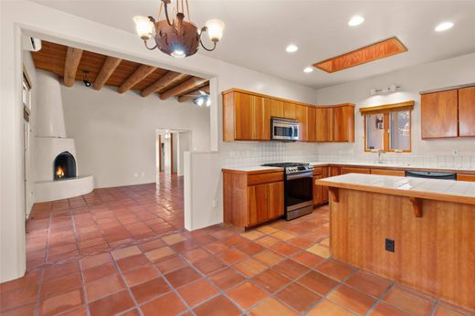 Classic Santa Fe charm meets modern comfort in this beautifully maintained 3-bedroom home spanning 1,907 square feet. Traditional wood vigas, Saltillo tile floors, and a classic kiva fireplace create an authentic Southwestern ambiance throughout. The updated kitchen features stainless steel appliances and opens seamlessly to inviting living and dining spaces — perfect for both everyday living and entertaining. The home has been thoughtfully upgraded, blending contemporary touches with timeless Santa Fe style. The spacious primary suite offers a private retreat, while the attached 2-car garage adds convenience and functionality. The yard is a private oasis filled with mature rose bushes. Located in a desirable Santa Fe neighborhood of Pueblos del Sol, which has walking paths, parks and playgrounds., this home embodies the best of classic design and modern living.
