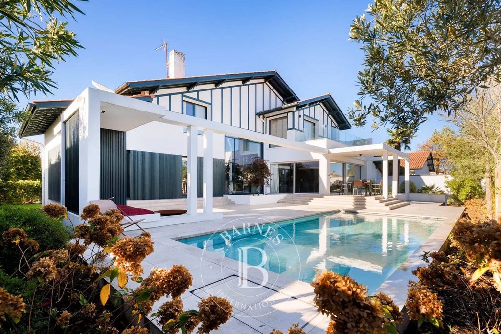 Very close to Biarritz Golf Course, in a peaceful setting, this beautiful 310 m² Neo-Basque style house has been fully renovated. Very bright, it features a spacious living room with a double-sided gas fireplace, 2 suites (including one on the ground floor), 2 additional bedrooms, and a studio that can be used independently. The property also offers an exceptional heated swimming pool with a movable floor and a large garage.
