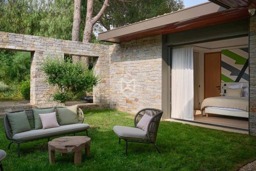 This villa features five en-suite bedrooms, including one upstairs with its own private balcony. The lower level is dedicated to wellness, with a massage room, a gym, a hammam, and two additional staff bedrooms.